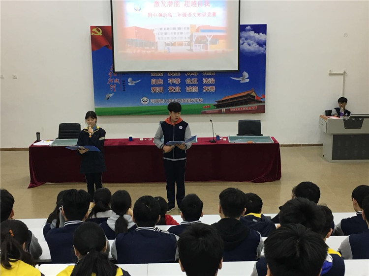五千年文化,三千年詩韻。中國文化博大精深,尤其古詩文是中華文化寶庫中璀璨的一顆明珠。在高中階段的學習以及高考考試中占有相當大的比重。為了激發(fā)孩子們學習古詩文的興趣,展示已學古詩文的掌握和理解情況,4月13日,經(jīng)過一輪班級測試的海選,高二年級來自四個班的四支班級代表隊集結(jié)完畢,整裝待發(fā),在附中雙語中學部主任溫志忠、高二年級主任和全體教師的見證下,激烈的比賽拉開了帷幕。