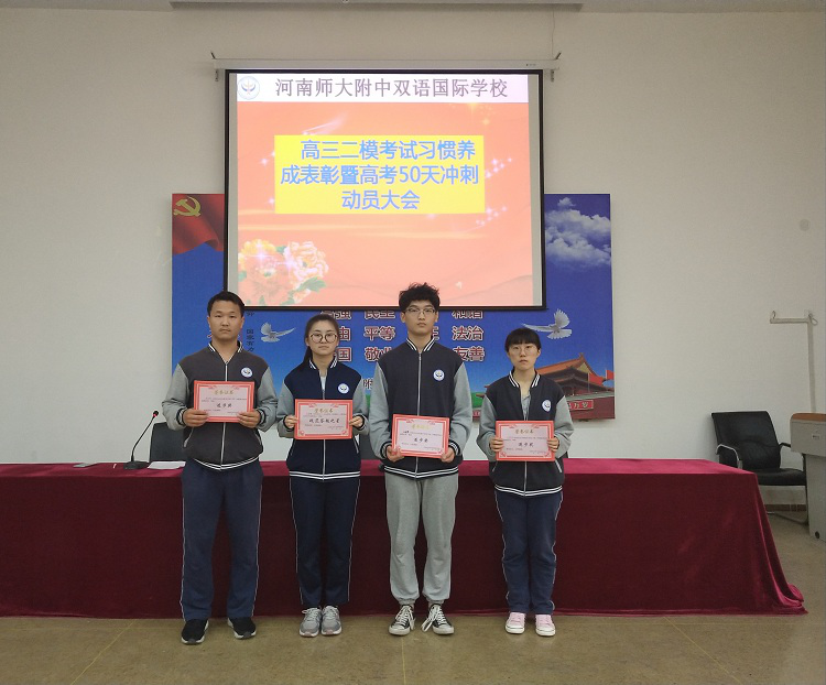 主持人王改老師宣布大會開始,年級主任白運亮宣讀受表彰學(xué)生名單,學(xué)生依次上臺領(lǐng)獎,任課老師及班主任為學(xué)生頒發(fā)獎狀和獎品。之后,每位獲獎的同學(xué)都說出了自己的心聲。他們或表情嚴肅,或輕松自然,或斗志昂揚,但無不表達了自己對高考的堅定信念。