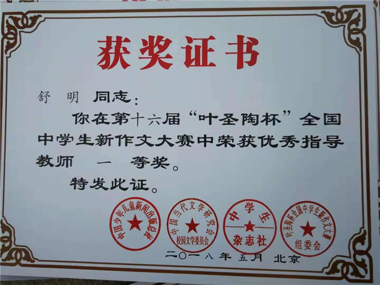 我校中學(xué)生在第16屆“葉圣陶杯” 作文比賽中斬獲一等獎(jiǎng)