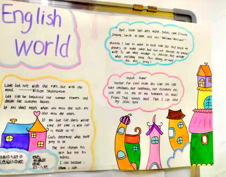 為了鼓勵同學(xué)們用英語學(xué)習(xí)、傳播文化,初一年級舉辦英文手抄報大賽。各班同學(xué)們接到通知后積極參與,每份作品都由同學(xué)們靜心設(shè)計(jì)、巧妙構(gòu)思,作品圖文并茂,色彩豐富。有利于鍛煉學(xué)生的英語寫作能力,發(fā)揮創(chuàng)造力,體現(xiàn)了學(xué)生良好的英語語言能力和優(yōu)秀的審美能力。