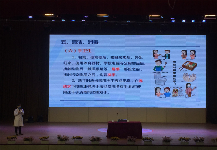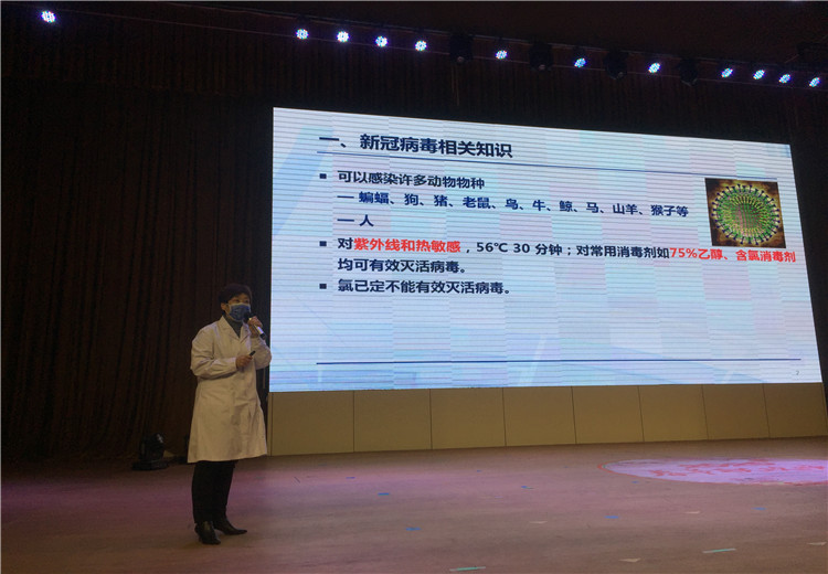 帥主任從新冠病毒相關知識、新冠病毒傳播途徑、如何做好個人防護、如何正確戴口罩、校園環(huán)境如何清潔消毒、隔離室的設置和管理制度、84消毒液如何配置及正確使用七個方面,向全體教職工進行了詳細講解,使大家對于學校疫情防控的全流程、各環(huán)節(jié)都有了科學明確的認知。講座過程中,帥主任根據(jù)自己豐富的知識儲備和經(jīng)驗積累,特別強調(diào)了一些細節(jié),如:氯已定不能有效滅活病毒;病毒對紫外線和熱敏感,56℃以上30分鐘即可被殺滅;地面和公共區(qū)域設施用有效氯250~500mg/L含氯消毒劑擦拭,隔離室、垃圾桶等需用有效氯500~1000mg/L消毒液消毒;門把手、鍵盤、鼠標等金屬物品表面不能用84等含氯消毒液,需用用75%的酒精清潔消毒;同一隔離室內(nèi)不能同時觀察兩個以上病種的患病學生等。