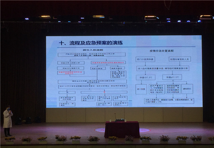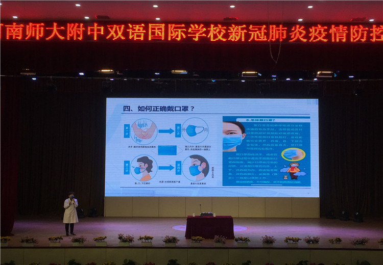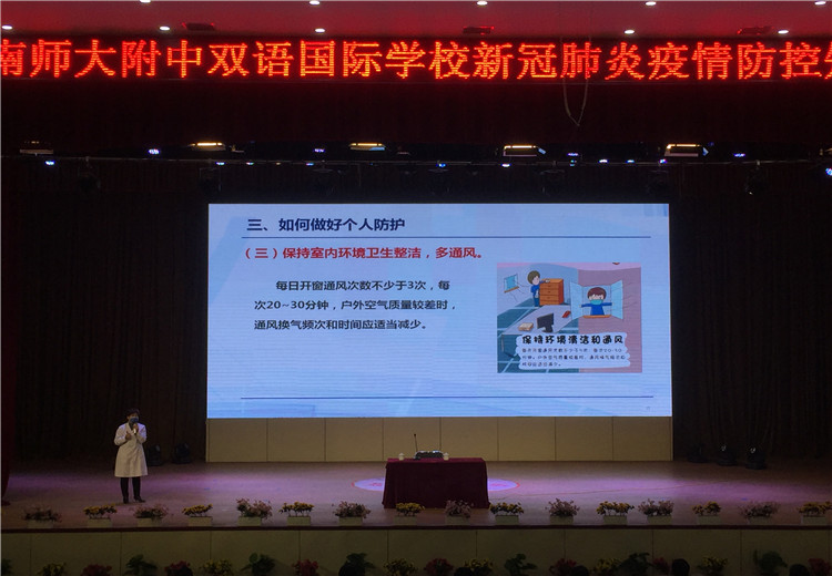 為了使全體教職工對新冠病毒有更科學的認識,也為了學校疫情防控措施的科學有效,2020年4月2日上午10點,新鄉(xiāng)市第二人民醫(yī)院感染科帥衛(wèi)紅主任應邀來到新鄉(xiāng)市河南師大附中雙語國際學校,在校劇場向全體行政人員、高三初三年級教師、生活老師、餐廳工作人員、物業(yè)工作人員進行了一場題為《學校疫情防控措施》的知識講座。我校中層以上領導參加培訓,培訓由羅強副校長主持。
