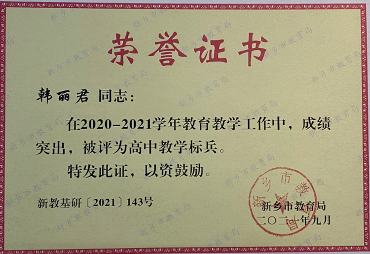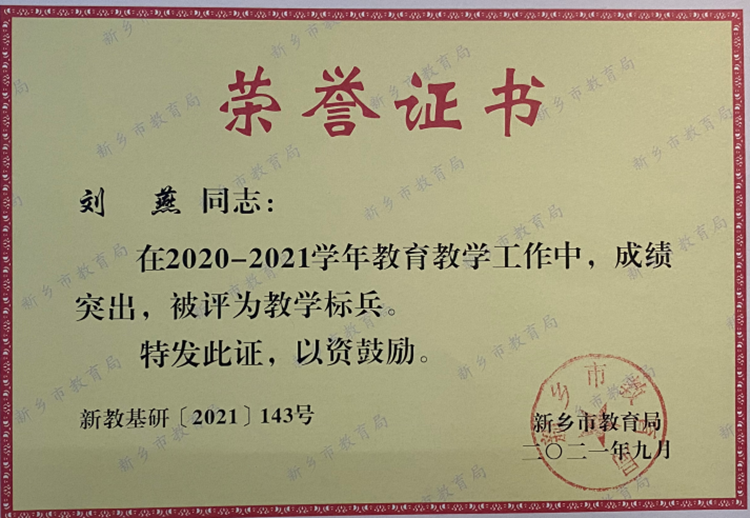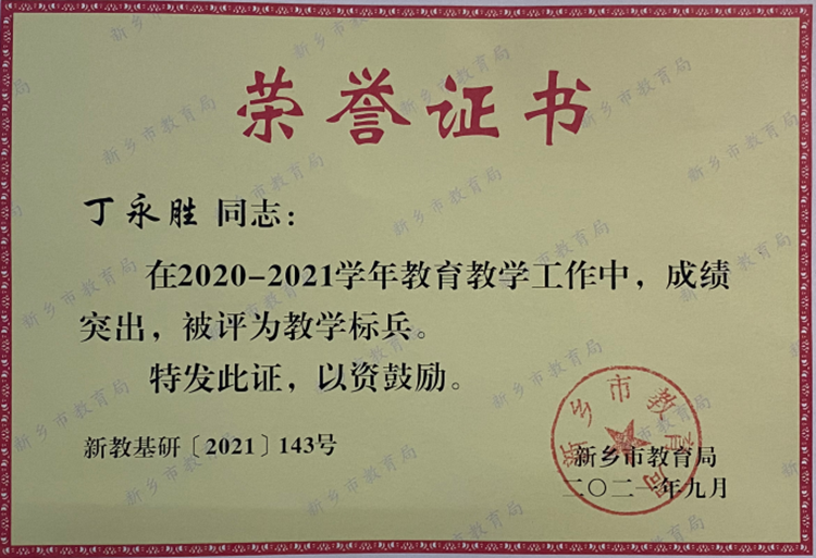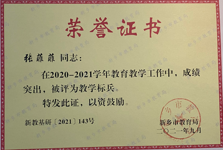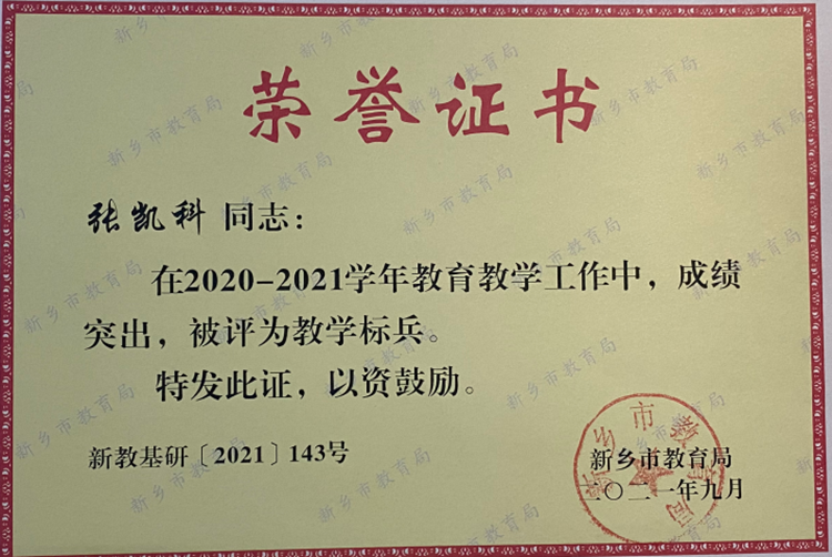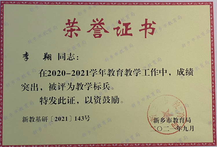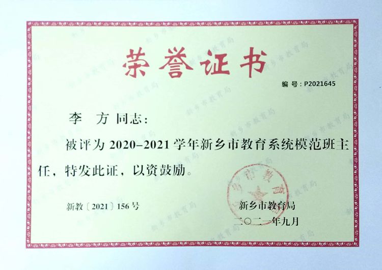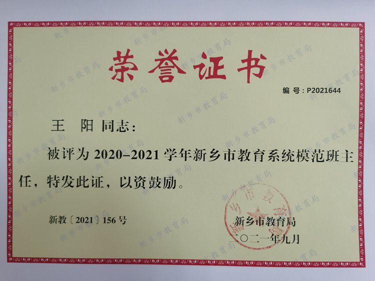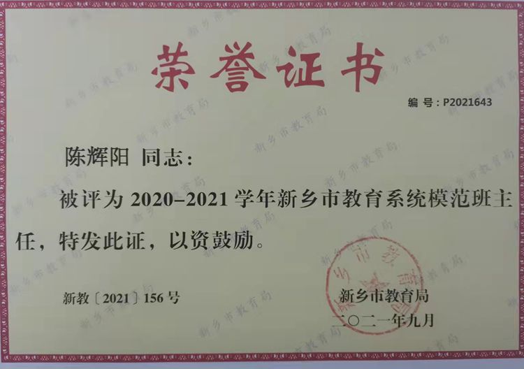 在2021年新鄉(xiāng)市教育系統(tǒng)模范班主任評(píng)選中,陳輝陽(yáng)、王鑫、舒明、王陽(yáng)和李方五位老師榮獲“2021年新鄉(xiāng)市模范班主任”稱(chēng)號(hào)。
