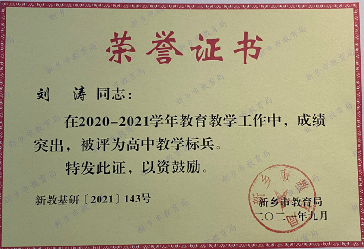 在2020-2021學(xué)年教育教學(xué)工作中,張菲菲、張凱科、丁永勝、劉燕、李翔五位老師被評(píng)為“初中教學(xué)標(biāo)兵”;劉濤、韓麗君兩位老師被評(píng)為“高中教學(xué)標(biāo)兵”。