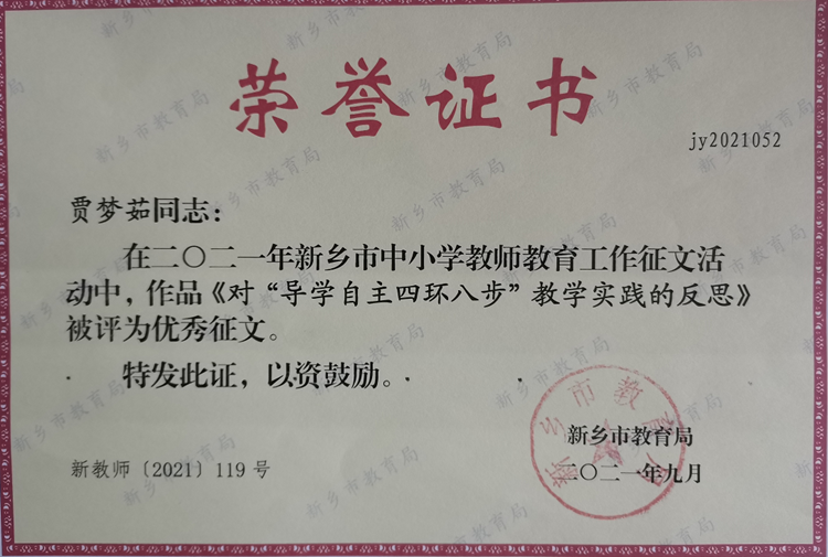 在2021年新鄉(xiāng)市中小學(xué)教師教育工作征文活動(dòng)中,陳丹靜和賈夢(mèng)茹兩位老師的征文榮獲優(yōu)秀征文。