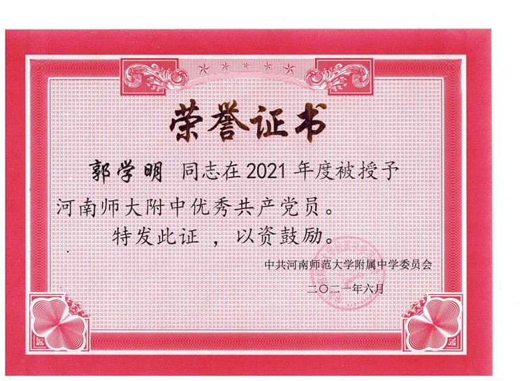 祝賀我校郭學(xué)明、崔丹、高亞超、閆曉穎、王曉慧、張慧娟等老師被評為河南師大附中“優(yōu)秀共產(chǎn)黨員”榮譽稱號。