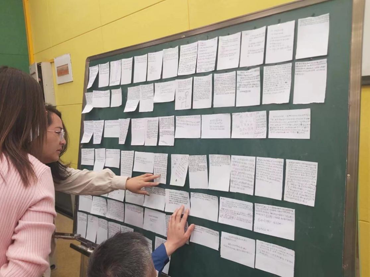 講座進(jìn)行之前,主持人宋云云老師與家長(zhǎng)將學(xué)生匿名寫(xiě)的《給家長(zhǎng)的建議》粘貼在黑板上供家長(zhǎng)觀看了解,便于父母?jìng)兏玫牧私夂⒆拥恼鎸?shí)感受。
