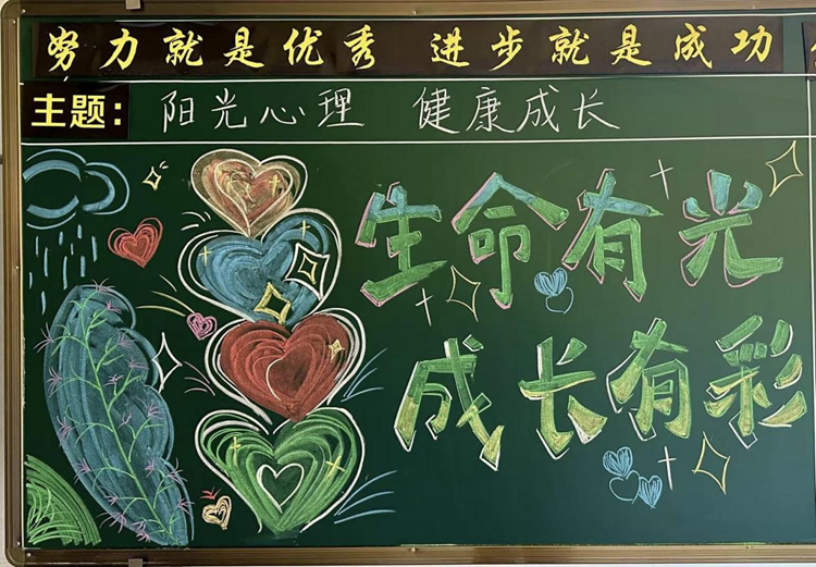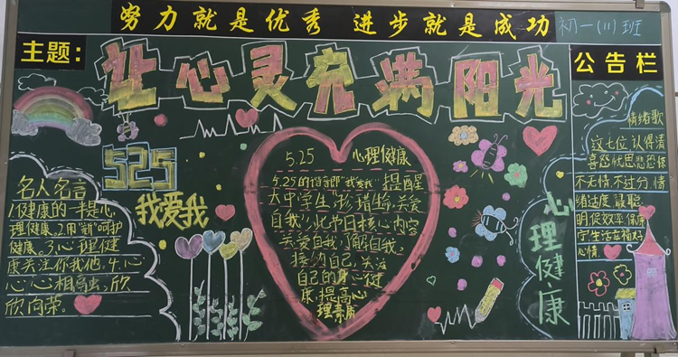 為進一步宣傳普及心理健康常識,引導學生樹立正確的心理健康觀念,營造健康、和諧、良好的校園育人氛圍,近日,我校開展了以“陽光心理 健康成長”為主題的525心理健康月主題黑板報活動。各班級精心策劃制作,呈現(xiàn)出一幅幅精美板報。