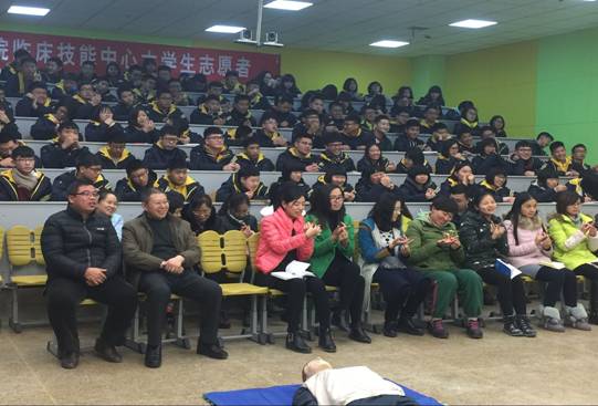 然后,新鄉(xiāng)醫(yī)學(xué)院臨床技能中心的志愿者們對(duì)全體教師和高一的同學(xué)們進(jìn)行了應(yīng)急救治實(shí)踐模擬演練,老師同學(xué)們都積極參與,熱情詢問,主動(dòng)模擬演練。