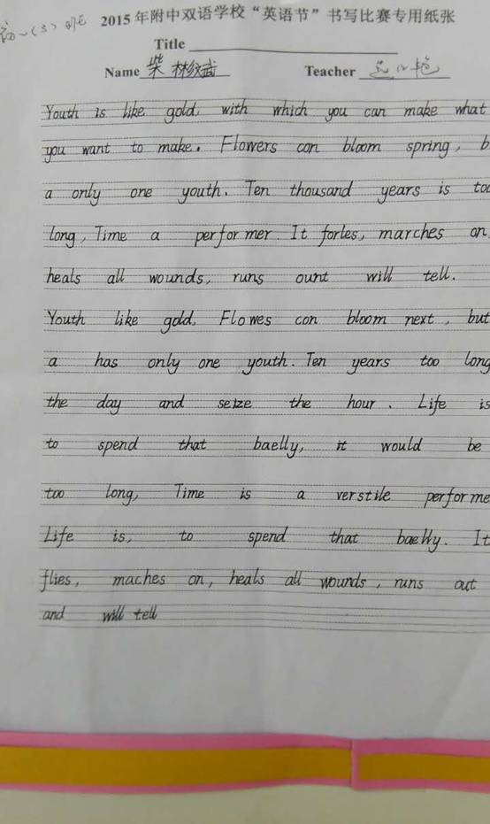 為了豐富校園文化生活,營造學(xué)習(xí)英語氛圍,提高學(xué)生綜合素質(zhì),讓學(xué)生學(xué)好英語、用好英語。河南師大附中雙語國際學(xué)校首屆英語節(jié)于12月1日盛大開幕,全校師生共同精心設(shè)計出系列英語活動主題。12月1日至12月7日舉行了中學(xué)部英語書法大賽。每名學(xué)生都積極參與,彰顯書法風(fēng)采。層層篩選之后,全體英語組教師共選出雙語國際學(xué)校首屆英語節(jié)書法大賽特等、一、二、三等獎。