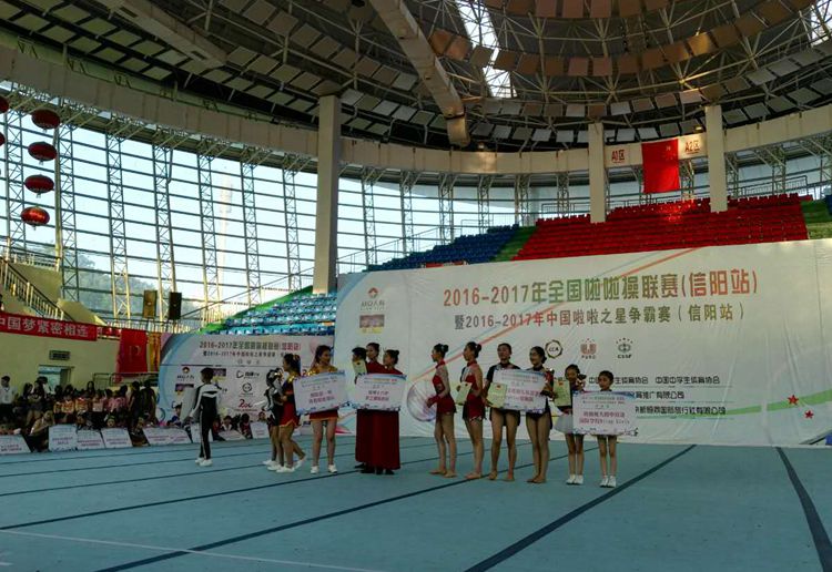 2017年5月16日至5月18日,由國家體育總局體操運動管理中心、中國大學生體育協(xié)會、中國中學生體育協(xié)會主辦的2016——2017年全國啦啦操聯(lián)賽(信陽站)暨2016——2017全國啦啦操之星爭霸賽(信陽賽區(qū))在信陽師范學院綜合體育館順利舉行。國家體育總局體操運動管理中心領導、全國啦啦操委員會領導等出席了盛大的開幕式。