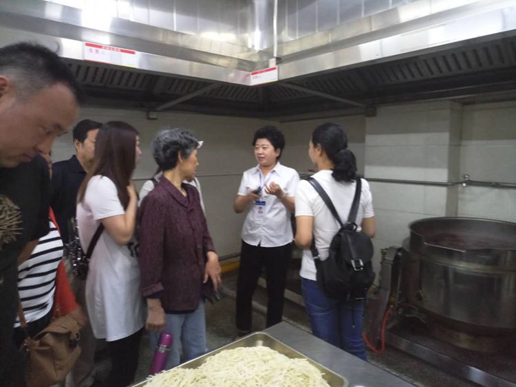 餐廳經(jīng)理帶領家長參觀后廚,與家長交流學生就餐情況