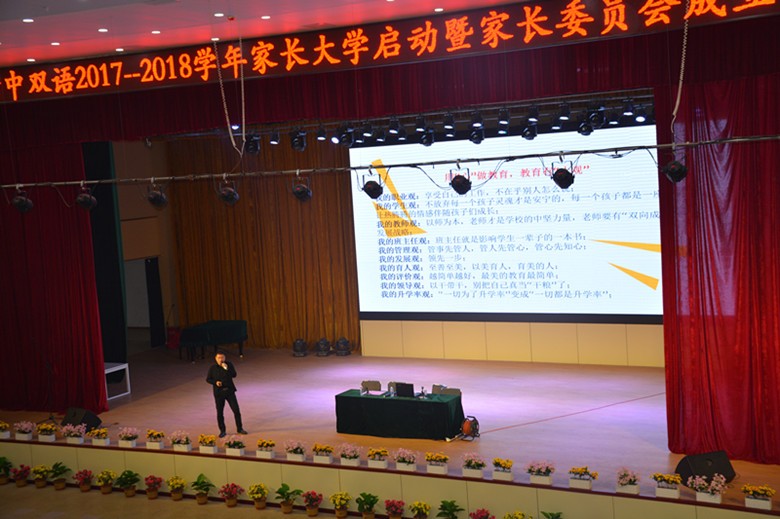 大會伊始,學校宣讀了2017——2018年家長大學暨家長委員會名單,明確了家長委員會的指導思想、組織結構、工作目標、責權義務等內容。與會領導為家長委員會成員頒發(fā)了聘書。初二(6)班學生家長何俊偉代表家長委員會發(fā)言,對雙學校成立2017——2018年家長大學暨家長委員會表示贊賞和支持,希望學校大膽探索,積極研究,努力填補家校共育的空白;同時,并呼吁所有家長扮演好宣傳員與信息員的角色,確保家校溝通的暢通無阻,共同促進和見證孩子的健康成長和全面發(fā)展。