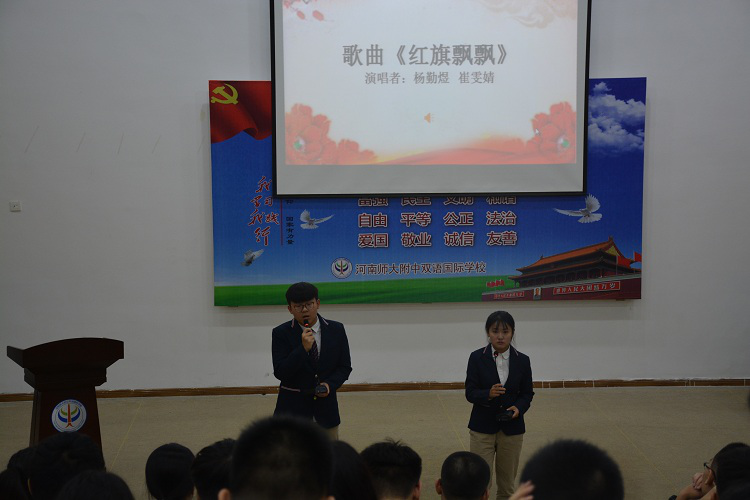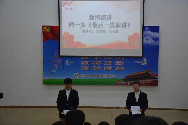 活動伊始,高三3班班主任楊玉冰老師從多方面解讀了中國社會主義的民主,并通過與西方國家的民主制度進行對比,進一步突出了中國社會主義民主制度的優(yōu)越性。接下來,高三學生楊勤煜、崔雯婧合唱一首《紅旗飄飄》,高亢而深情,歌聲中充滿了對祖國的熱愛,贏得了大家熱烈的掌聲。之后劉伯陽,閆保凱兩位同學的《最后一次演講》將此次活動推向高潮。他們慷慨激昂,頌揚了李先生為民主與和平而獻身的愛國主義精神。緊接著,學生代表劉凌菲,楊柯,張?zhí)m欣,李佩澤進行了配樂詩朗誦《核心價值觀,引領向前看》。最后,副校長羅強壓軸登場,他強調(diào)要牢記社會主義核心價值觀24字,并分享了自己的快速記憶法,說到民主,他說:“學生的民主就是公平競爭?!彼悠诖髂赀@個時候大家一起相約聚會的場景。
