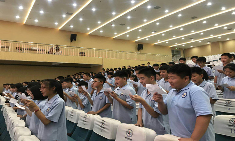 最后,初一年級全體學(xué)生在主持人荊佳慧同學(xué)的帶領(lǐng)下,全體起立,共同宣誓:做一個勤勞的人,做一個善良的人,做一個誠實守信的雙語人。在莊嚴(yán)肅穆的宣誓中,河南師大附中雙語國際學(xué)校社會主義核心價值觀大講堂之“誠信大講堂”篇圓滿結(jié)束!